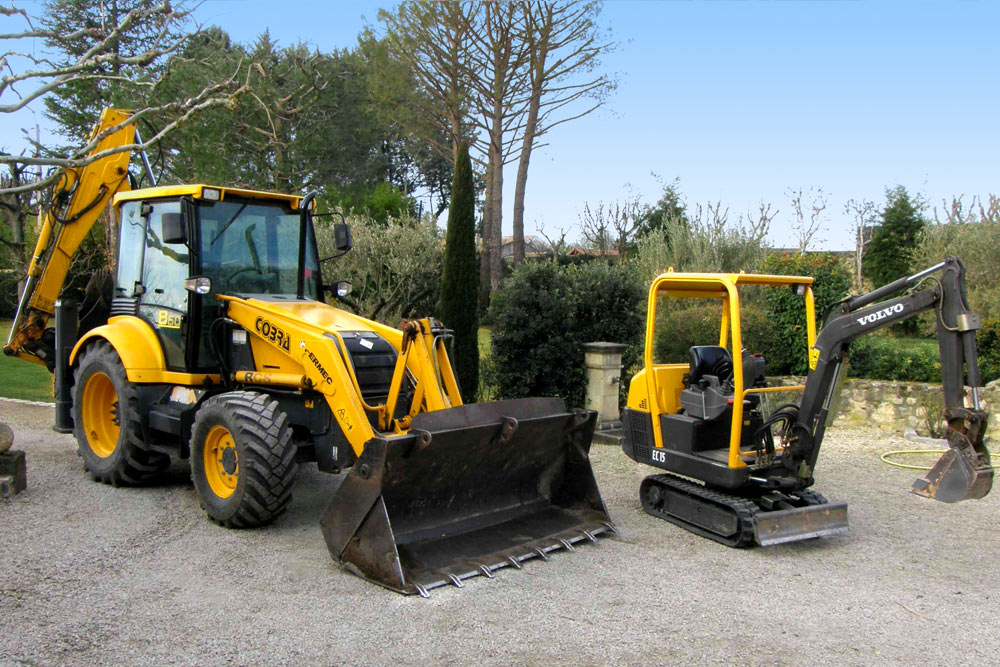 Si vos travaux nécessitent des équipements particuliers, nous disposons de tout le matériel de terrassement nécessaire : mini-pelles, camions-bennes, broyeuses, tondeuses portées ou auto-portées, tractopelle, brouette à chenille...